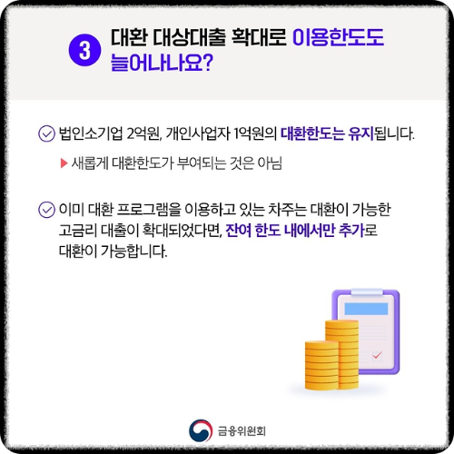 이미 대환 프로그램을 이용하고 있는 차주는 대환이 가능한 고금리 대출이 확대되었다면, 잔여 한도 내에서만 추가로 대환이 가능합니다.
