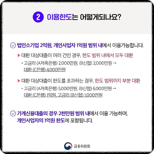 법인소기업 2억 원, 개인사업자 1억 원의 대환한도는 그대로 유지됩니다. 즉, 새롭게 대환한도가 늘어난 것이 아닙니다.