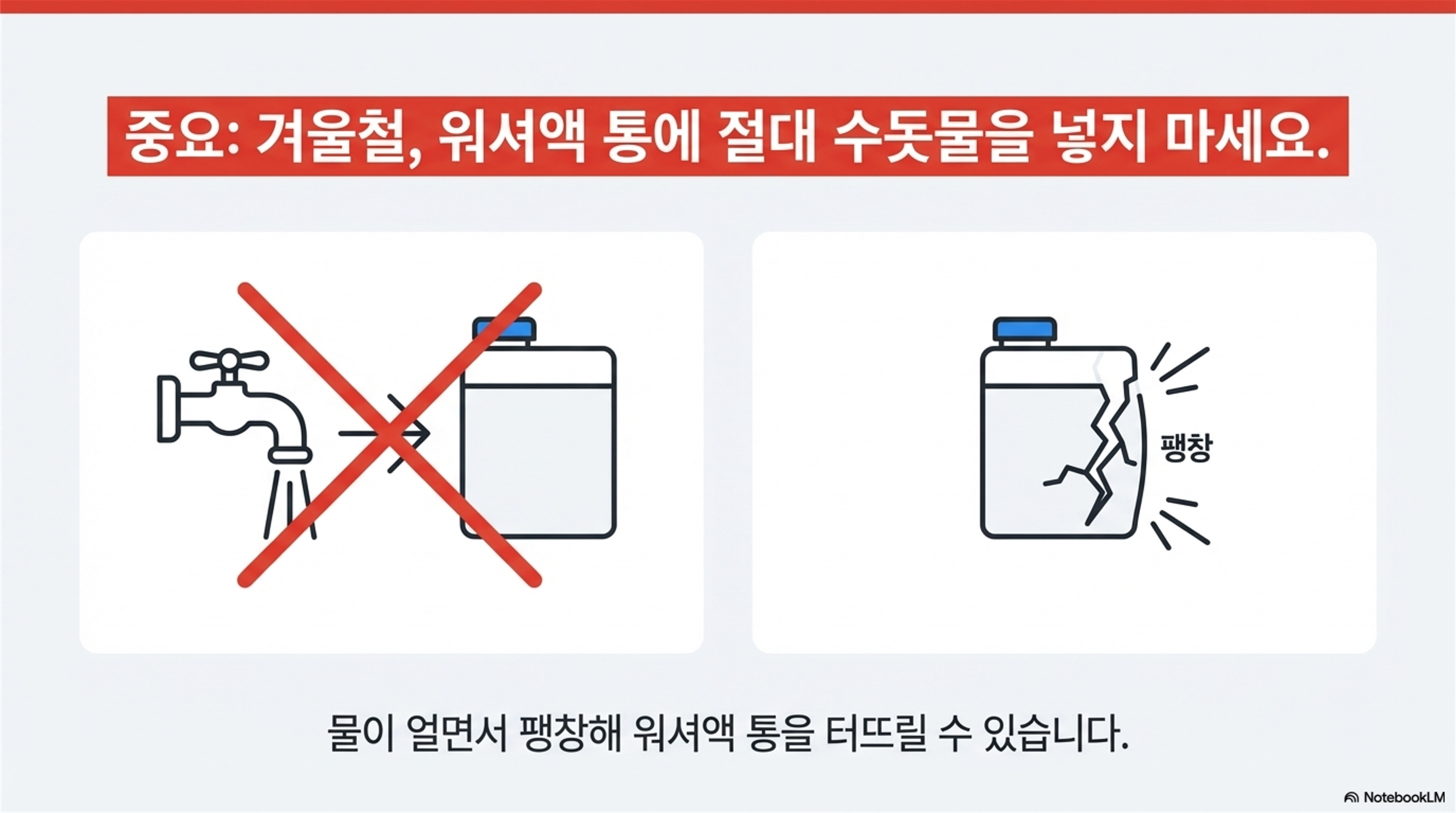 여기서 잠깐! 겨울철에는 워셔액 통에 절대 수돗물을 보충하면 안 됩니다. 물이 얼면서 팽창해 워셔액 탱크가 터져버릴 수 있으니, 반드시 어는 것을 방지하는 에탄올 기반의 사계절용 워셔액을 사용해야 합니다.