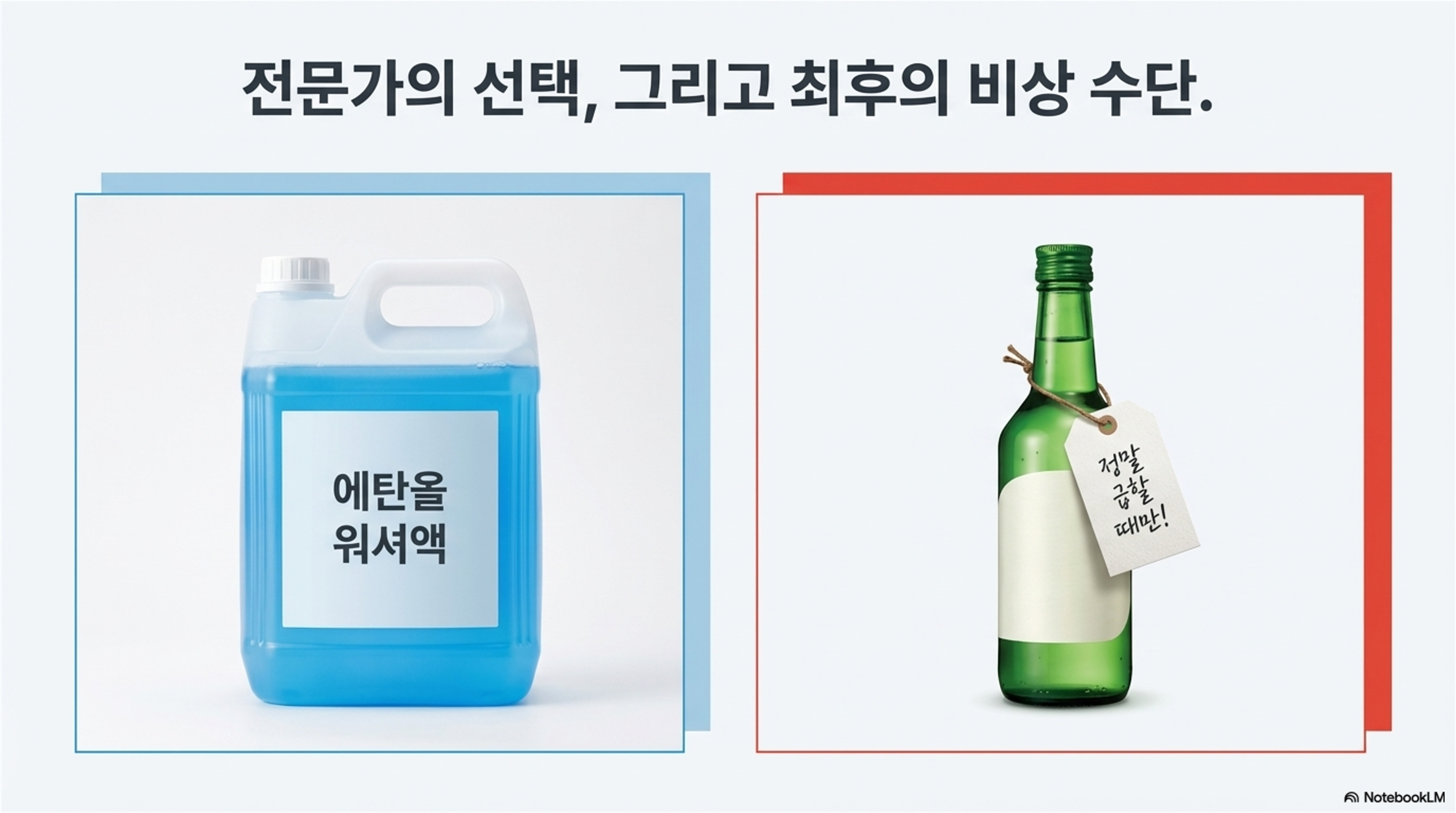 소독용 에탄올도, 편의점도 없는 최악의 상황에서도 방법은 있습니다. 바로 여러분의 차 안에 이미 들어있는 '에탄올 워셔액'을 활용하는 것입니다. 이 방법은 아무 도구 없이 가장 빠르고 안전하게 성에를 제거할 수 있는 최고의 꿀팁입니다. 다음 단계를 그대로 따라 해 보세요.